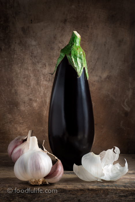 Aubergine With Garlic On Wood